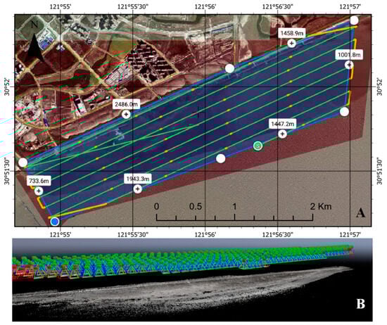 The entire tidal flat monitoring using M300-LiDAR was undertaken on 19 July 2023 (Figure 5) when the spring tide was at its lowest level. In this UAV-based survey, the UAV was configured with specific parameters to ensure optimal data collection. The flight was conducted at an altitude of 100 m above the study area, allowing for a comprehensive aerial perspective. The UAV maintained a consistent speed of 5 km/h, ensuring a controlled and efficient survey process. To capture detailed information, data sampling occurred at regular intervals of 20 m along the flight path. This sampling strategy was implemented to enhance spatial resolution and provide a thorough representation of the targeted area. The entire survey mission had a duration of 40 min, during which the UAV systematically covered the designated region, facilitating a comprehensive and timely data acquisition process. These carefully defined settings were instrumental in achieving accurate, reliable, and timely results for the study. The observed data underwent processing using DJI Terra, an official software (https://enterprise.dji.com/cn/dji-terra, accessed on 21 March 2024) that employs photogrammetry and LiDAR technologies to generate 2D and 3D maps of diverse environments.