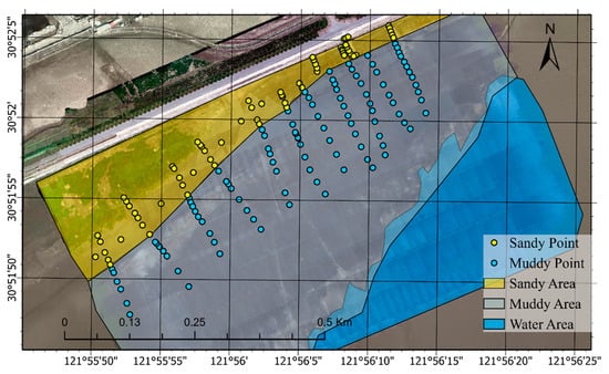 The study area was further divided into sandy, muddy, and water areas based on the images obtained by the UAVs. Points collected within these zones were classified into two groups: sandy and muddy. This classification aimed to evaluate how coastal geological characteristics impact the precision of the DSMs. By analyzing data from these distinct geological contexts, we can better understand the variability in DSM accuracy, attributing discrepancies to the specific geophysical properties of each area.
