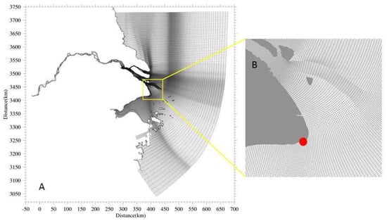 The ocean model used in this study is Ecom-si [41,42], which has undergone extensive calibrations in prior studies [42,43,44]. The mesh domain encompasses the Changjiang River Estuary and Hangzhou Bay, with a resolution of 150 m in the vicinity of the study area. In this study, our primary dynamic factor from ocean focus lies on the tidal level, which is predominantly influenced by the propagation of tides from the ocean, river runoff from upstream, and wind-induced coastal circulation. The open sea boundary consisted of the tidal harmonic constants of 15 constituents (M2, S2, N2, K2, K1, O1, P1, Q1, MF, MM, MN4, M4, MS4, S1, and 2N2) obtained from the TPXO9 database (https://www.tpxo.net/global/tpxo9-atlas, accessed on 21 March 2024). The wind condition is sourced from the European Centre for Medium-Range Weather Forecasts (ECMWF), a widely used dataset. The river boundary condition was defined as volume flux based on data measured at the Datong hydrological station in the upstream area of Changjiang River. The model mesh is shown in Figure 7.