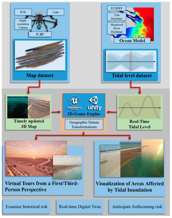 Consequently, to the best of our knowledge, there is still a need for an accurate, intelligent, and intuitive tool to assess the risk in a specific tidal flat at the highest possible spatial and temporal resolution. This study aims to address this gap through the following steps: (1) evaluating the performance of different UAVs for coastal monitoring, with specific emphases on UAVs equipped with different sensors or modules; (2) building a high-resolution 3D coastal terrain efficiently from the most suitable UAV; (3) employing a highly accurate ocean model to generate the time series of tidal level; and (4) developing a digital twin of the actual coast to visualize and assess coastal risks by integrating rapidly monitored terrain data with the numerical ocean model based on a 3D engine. This innovative framework promises to offer accurate tidal level predictions, providing valuable insights for mitigating the risks associated with rising seawater levels. It can not only showcase the current state of the tidal flat but also review conditions over a period, including reproducing the past and predicting the future. Ultimately, this paper contributes to the broader discourse on effective coastal management and the integration of cutting-edge technologies in addressing emerging environmental challenges.
