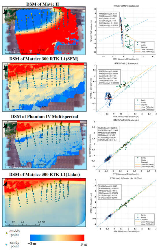 As indicated by the results, the accuracy of the DSM generated by LiDAR was the highest, exhibiting the best fit and lowest errors for both sandy and muddy areas. Under the same conditions, the accuracy of the DSM generated using the SFM method was slightly lower in muddy areas compared to sandy areas. This discrepancy may be attributed to sunlight reflections on the water puddles covering the surface of the muddy beach, whereas SFM depends on ambient light and is weak in water reconstruction. Additionally, the lack of prominent ground objects in the intertidal zone’s muddy beach for feature point extraction with the SFM method further contributed to speckle errors in the DSMs generated by the Matrice 300 RTK and Phantom IV Multispectral. The performance of the Mavic II Pro without an RTK system raised concerns, especially in scenes with high precision requirements. Our observations indicate that the DSM boundaries exhibited higher errors.