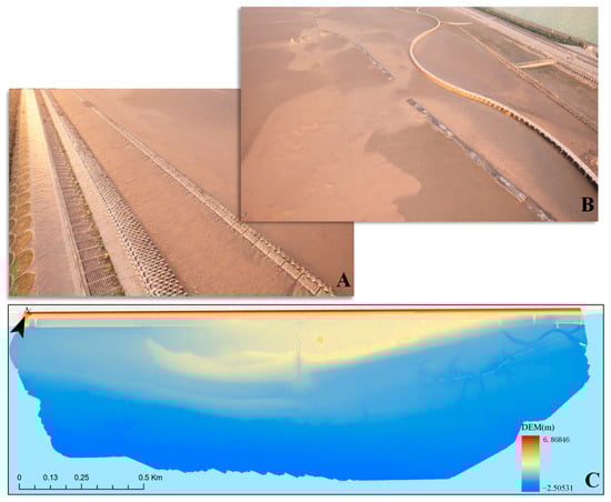 Manual in situ measurements (e.g., via real-time kinematics, RTK) have been considered the most common way to obtain tidal flat topography. However, manual on-site measurements are not the optimal choice. On the one hand, the seasonal variations or responses to extreme weather conditions necessitate the timely acquisition of the latest topography (e.g., within a weekly time frame); on the other hand, when confronting risks in the tidal flat, manual measurements inherently pose potential safety risks. Therefore, unmanned aerial vehicle (UAV) surveys may currently be a more feasible approach, capable of both obtaining topographical data and capturing high-resolution photographs. For industrial or mapping UAVs, the RTK module is an essential component for georeferencing UAV images. To meet a range of research needs, these UAVs might integrate different sensor modules, including super high-resolution cameras, multispectral cameras, LiDAR, thermal imaging cameras, and aerial sensors [17,18,19,20].