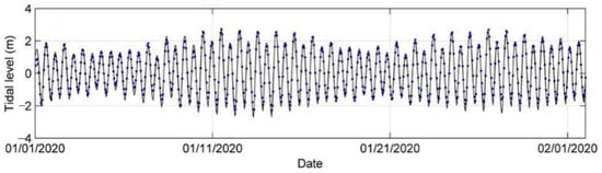 Validation of tidal levels in January 2020, with tidal data sourced from the nearest tidal gauge. The solid line and blue dot represent modeled results and measured data, respectively.