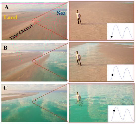 The simulated progression depicts the tidal level rising while an individual stands in the tidal channel. (A–C) represent moments ranging from the low tidal level to the high tidal level.