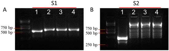 PCR-analysis of A. alternata and X. campestris. (A) PCR-analysis of A. alternata and X. campestris using S1, (B) PCR-analysis of A. alternata and X. campestris using S2, where 1 represents A. alternata, and 2, 3, and 4 represent three kinds of X. campestris.