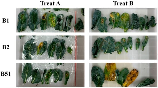 The comparison of different identification methods for black spot disease in broccoli. Treat A: adding 80 μL bacterial solution to the wound and then wiping it evenly; Treat B: spraying bacterial solution on the leaves. B1, B2, and B51 were the three varieties used for testing.