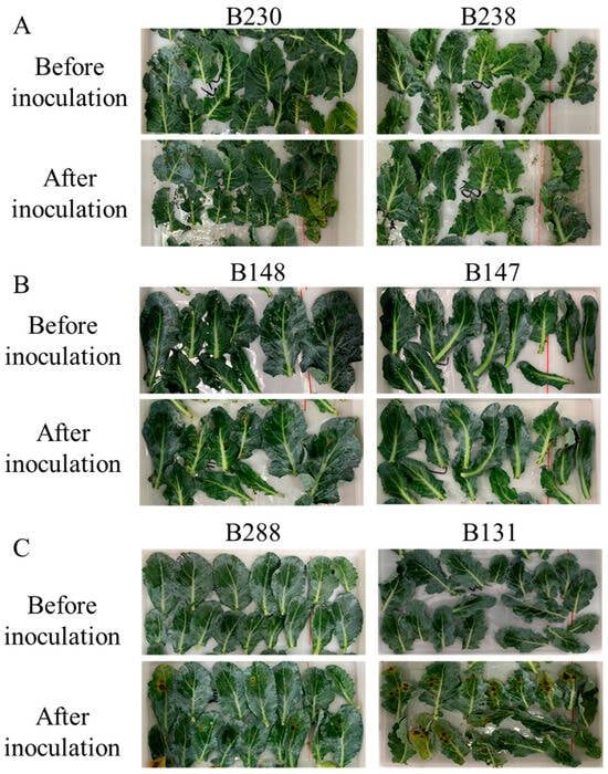 In this study, we conducted resistance identification for black spot disease and found plenty of excellent varieties, which show strong resistance to black spot disease in broccoli. Based on the standards of BSI calculation, 58 lines were resistant to black spot disease, accounting for 33.5% of total accessions evaluated. Additionally, 65 lines showed a certain level of tolerance to black spot disease, and 50 lines were found to be susceptible (Table 2; Supplementary Table S1). Meanwhile, we collected phenotype photos of all materials before and after infection and found there were significant phenotypic variations among differential resistance materials (Figure 4 and Figure 5). B230 and B238 both belong to highly resistant lines; there were no obvious changes on their leaves before and after infection. The leaves of B148 and B147 had slight spots after infection, indicating that these plants have resistance to pathogens. Compared to those varieties with disease resistance, B288 and B131 have an obvious susceptible phenotype, with several big circular spots distributed on the leaves. However, the lesions did not affect the morphology of the leaves, so we classified these lines into disease tolerance. In addition to the three categories mentioned above, there were two classes manifested as susceptible to A. alternata. The leaves of B253 and B181 had a noticeable change after pathogen treatment, with enlarged lesions and a yellow halo, reflecting weak disease resistance. Meanwhile, B346 and B314 had more severe infectious reactions and yellowing areas and the number of lesions had significantly increased. The results above showed significant differences among the five types of accessions and indicated the method is suitable for resistance identification.