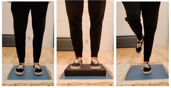 (Left): A participant standing on the force platform on both feet during the clinical test of sensory interaction and balance (CTSIB) test; (Middle): A participant standing on a foam pad placed on the force platform on both feet during CTSIB test; (Right): A participant standing on the force platform on one foot during unilateral stability test.