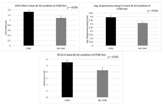 The independent t-test of CONC vs. NO CONC groups revealed a significant difference in postural sway between groups in COP-X max (p = 0.036; t = 2.21; d = 0.81), Avg. Displacement along X (p = 0.016; t = 2.57; d = 0.95), and 95 EA (p = 0.043; t = 2.12; d = 0.78) sway variables during the foam BL EO condition (Figure 2). The descriptive statistics for all three variables demonstrated higher values for the CONC group than the NO CONC group. No significant differences between CONC vs. NO CONC groups were observed in firm BL EO, firm BL EC, or foam BL EC conditions.