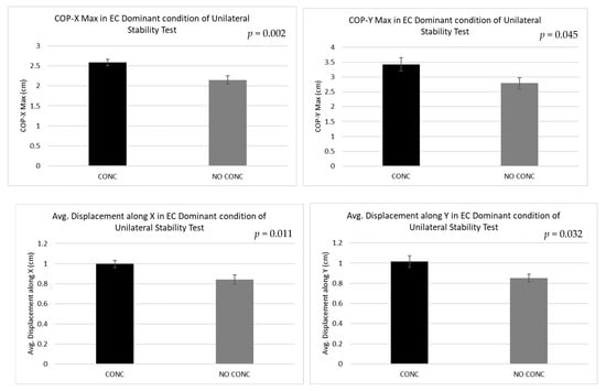 Significant postural sway variables between the individuals with a history of concussion (CONC) and those without concussion (NO CONC) in eyes closed (EC) dominant condition of the unilateral stability test. (Top left) COP-X max; maximum center of pressure (COP) excursion in the anterior-posterior direction. (Top right) COP-Y max; maximum COP excursion in the medial-lateral direction. (Bottom left) Avg. Displacement along X; average COP displacement in the anterior-posterior direction. (Bottom right) Avg. Displacement along Y; average COP displacement in the medial-lateral direction. Bars represent standard errors.