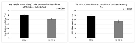 During this test, significant differences in sway between CONC and NO CONC groups were evident in the DOM EC and ND EC conditions. In DOM EC condition, COP-X max (p = 0.002; t = 3.41; d = 1.26), COP-Y max (p = 0.045; t = 2.09; d = 0.77), Avg. Displacement along X (p = 0.011; t = 2.72; d = 1.00), Avg. Displacement along Y (p = 0.032; t = 2.26; d = 0.83), and 95 EA (p = 0.024; t = 2.38; d = 0.88) demonstrated significant differences with greater postural sway in the CONC group compared to the NO CONC group (Figure 3). Similarly, in ND EC condition, COP-Y max (p = 0.042; t = 2.14; d = 0.79), COP-Y min (p = 0.046; t = 2.09; d = 0.77), Avg. Displacement along Y (p = 0.009; t = 2.80; d = 1.03), and 95 EA (p = 0.043; t = 2.12; d = 0.78) demonstrated significant differences with greater postural sway in the CONC group compared to the NO CONC group (Figure 4). The descriptive statistics for all variables demonstrated higher values for the CONC group than the NO CONC group in both conditions. No significant differences between CONC vs. NO CONC groups were observed in DOM EO or ND EO conditions.