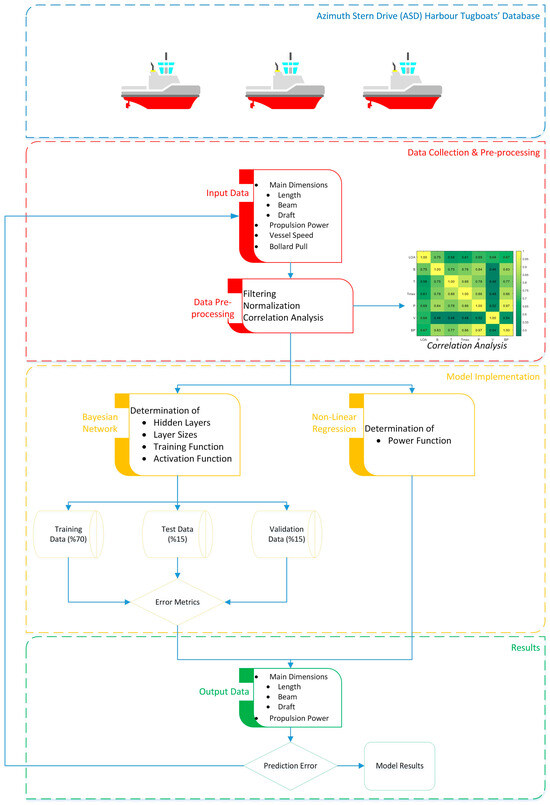The models proposed within this research are dynamic in nature and specifically tailored for tugboats. However, in forthcoming studies, these models have the potential to be modified for various other vessel types. Achieving this adaptation necessitates updating the inputs in accordance with the specific characteristics of the target ship type. Furthermore, future research endeavors hold the promise of enhancing model robustness through parameter optimization techniques. Future studies may delve into incorporating additional ship parameters such as displacement, tonnage, vessel hull form coefficients, towing speed, the number of propellers, propeller diameters, which are not considered here, constructing models with greater accuracy through larger datasets, or exploring alternative neural network modeling methods for different specific ship types. Furthermore, neural network models can be integrated into existing design software utilized by ship designers and naval architects, enabling predictive modeling capabilities to be seamlessly incorporated into the ship design workflow. This enables ship designers to leverage advanced analytical tools without requiring specialized expertise in machine learning.