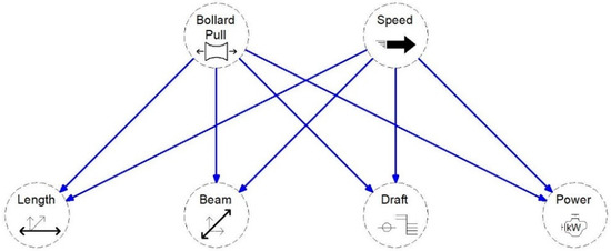 The structure of the Bayesian network model for this investigation is depicted in Figure 9. This model has two inputs (bollard pull and speed) and ten hidden layers with five outputs (length, beam, draft, draft-maximum, and power).