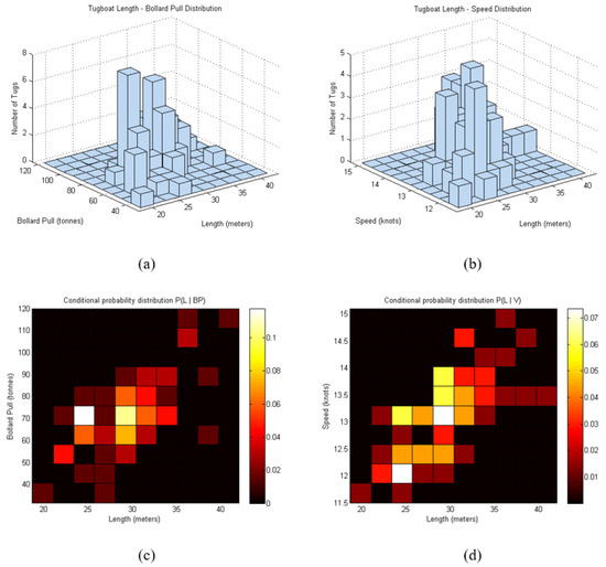 Figure 6 presents the distribution of bollard pull and speed parameters, as well as the conditional probability distribution relative to vessel length for the collected dataset. When examining these conditional probability distributions, the peak probability is observed around 70 metric tons BP at approximately 30 m in length and a speed of approximately 13 knots.