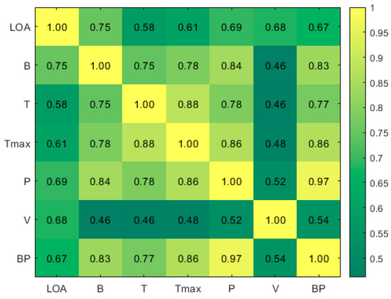 In this study, the Pearson correlation coefficient is computed from the collected data and visually represented in Figure 7. The intricate relationship between these variables is delineated in Figure 8. The figures illustrate a robust correlation between the data of length (LOA), beam (B), draft (T), draft-maximum (Tmax), and power (P) and bollard pull (BP), whereas the correlation with speed (V) is relatively weaker.