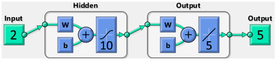 Bayesian regularization, as a network training function, optimizes weight and bias values using Levenberg–Marquardt optimization. This method minimizes a combination of squared errors and weights, identifying the optimal combination to construct a network with robust generalization. Implemented in MATLAB R2013b as the “trainbr” trainer, the training process depends on the function’s parameters. Validation vectors are employed to halt training prematurely if the network’s performance on the validation vectors does not improve or remains constant for “max_fail” epochs consecutively. Bayesian regularization does not use a separate validation set but includes it in the training set [10]. Test vectors serve as an additional check for the network’s generalization but do not impact the training. Enabling validation by setting “max_fail” to any strictly positive number ensures weight/bias minimization with shorter training times. Regarding the performance function, this approach shares the same constraint as “trainlm”.