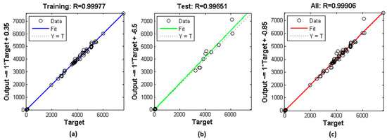 Bayesian regression graphics for (a) training, (b) test and (c) total process, of the developed network.