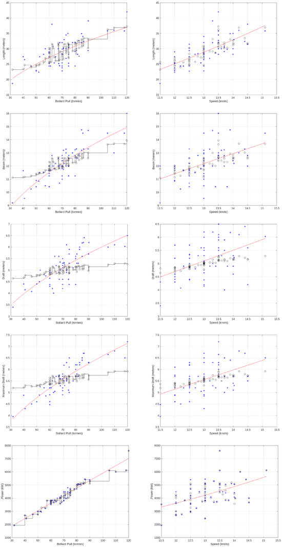 The total engine power and hull from parameters of the tugboats with many other parameters such as propeller parameters are limitations for tugboats’ maximum speed and bollard pull force [54,55,56]. Therefore, the dependent parameters for tugboats, namely bollard pull (BP) and ship speed (V), can be expressed as functions of the primary independent variable parameters related to a tugboat’s main dimensions: length (L), width (B), draft (T), block coefficient (CB), and main propulsion power (P). Additionally, other independent variable parameters influencing the bollard pull and ship speed include the vessel’s hull form, heel and trim conditions, and the configuration of the propulsion system, encompassing the main engine(s) and power transmission equipment(s). Environmental conditions, such as currents, waves, sea state, wave dimensions, water depth, and towing rope length, also contribute to the variability of bollard pull and ship speed parameters [49].