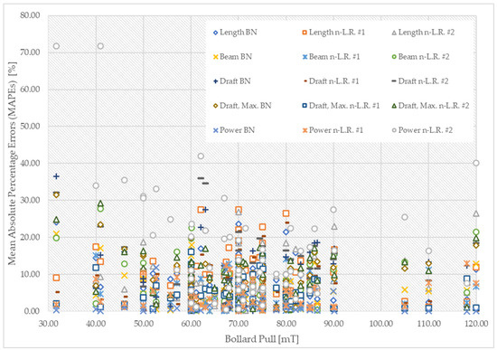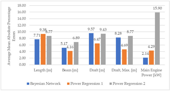 To assess the efficacy of the developed model, error metrics were computed from the prediction results for both the Bayesian network and power regression. The calculated mean absolute percentage errors (MAPEs) for each output parameter—length, beam, draft, maximum draft, and power—are presented in Figure 13, while the averages of the MAPEs are depicted in Figure 14.