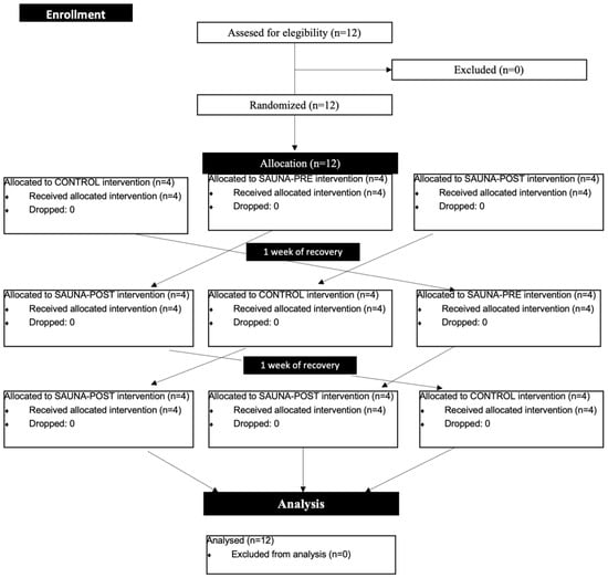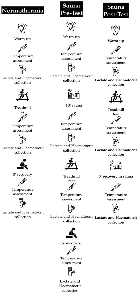 A randomised cross-over design was carried out. The participants were randomised into three groups. They performed the same physical test at ambient temperature (22 °C ± 2 °C; 20% RH) with different conditions: without sauna before or after the test (normothermia), with 10 min of sauna before the trial (hyperthermic pre), and with 5 min recovery in a sauna after the test (hyperthermic post). Blood lactate and haematocrit were collected in a basal condition, immediately after the trial and after 5 min of recovery. Additionally, in the hyperthermic pre condition, another sample of both haematocrit and blood lactate after the sauna bath was collected. Each trial was separated by one week to avoid fatigue. The consort flow of the study design is shown below. Furthermore, Figure 1 and Figure 2 shows the outline of the study design.