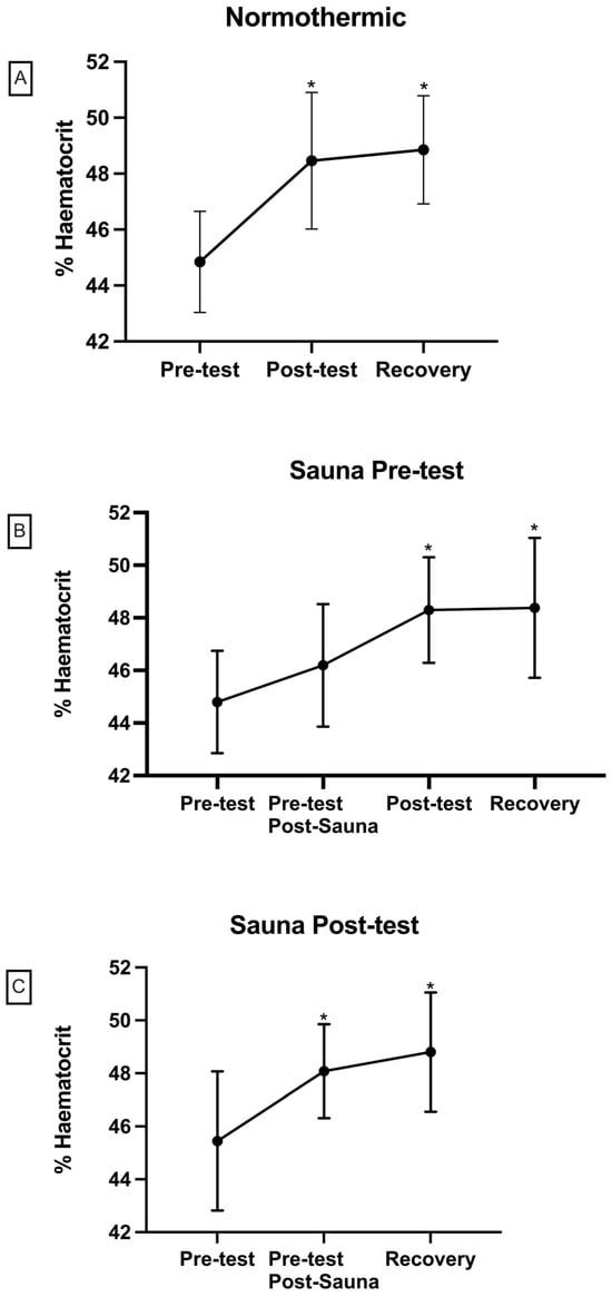 Haematocrit concentrations in each test ((A) = normothermic; (B) = sauna pre-test; (C) = sauna post-test). Differences with respect to pre-test (* p < 0.05).