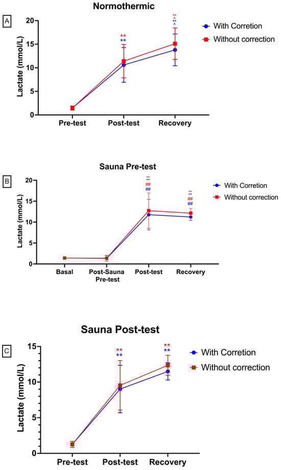 Lactate values in each test ((A) = normothermic; (B) = sauna pre-test; (C) = sauna post-test). Red colour: lactate levels without correction for haemoconcentration. Blue colour: values with correction for haemoconcentration. Differences with respect to pre-test or basal: ** p < 0.01. Differences between pre-test and recovery values: ^ p < 0.05. Differences in comparison of post-sauna and pre-test: ## p < 0.01.