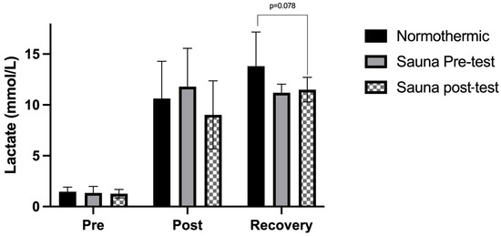 This figure shows the comparison between three conditions. In the hyperthermic pre-test condition, the pre-test lactate values are after the sauna bath. All values were corrected for haemoconcentration.
