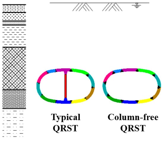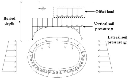 - Synchronous grouting condition. After the tunnel structure comes out from the shield tail, the external soil–water pressure and grouting pressure are resisted by the column-free QRST structure and the temporary support, the load-bearing state of which is similar to that of the typical QRST structure, as shown in Figure 15.