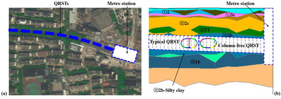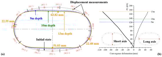- At the service stage with a designed buried depth of 13 m, the inward vertical convergence deformation along the short axis of the structure is 108.64 mm, while the outward horizontal convergence deformation along the long axis is 49.03 mm. The column-free QRST structure predominantly experiences inward deformation;