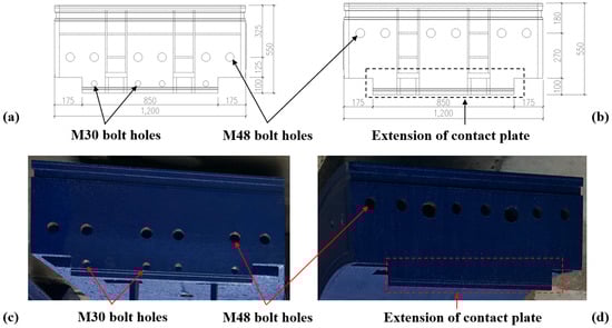 - Joints: All joint contact plates can be fully extended with a width of 1200 mm. For positive moment joints, change the positions of M48 bolts and M30 bolts to fully exploit the load-bearing capacity of M48 bolts. For negative moment joints with waterproofing permitted, the position of bolts is suggested to be fully moved toward the external surface direction.