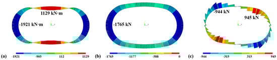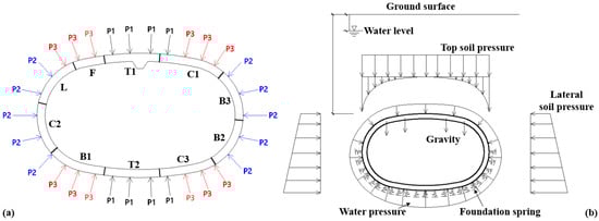 - Column removal condition. Subsequently, the temporary column is removed slowly to ignore the dynamic structural response. During this process, soil–structure interaction is simulated by a set of foundation springs surrounding the tunnel structure. The final state of the structure is the same as that depicted in Figure 6b.