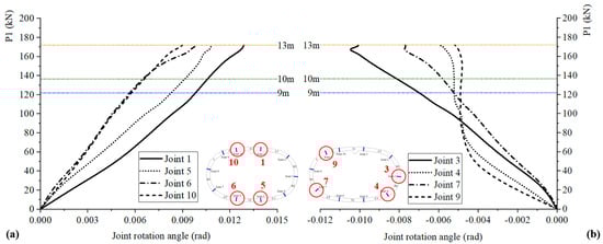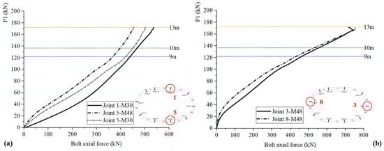 - The development of joint deformations and bolt axial forces indicates that as the load level increases, among the positive moment joints, deformations and internal forces of Joints 1 and 5 develop faster than those of Joints 6 and 10. For negative moment joints, Joints 3 and 8 exhibit faster development compared to Joints 2 and 7, with Joints 4 and 9 exhibiting only rapid initial development. Based on the experimental results, it is recommended that the bolt dimension and bolt position for negative moment joints be optimized, and the rows of M48 and M30 bolts be repositioned for positive moment joints, with the help of sophisticated finite element models;