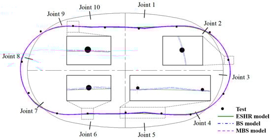 - Asymmetry in structural deformation. Considering that longitudinal joints represent the most significant characteristic of segmental tunnel linings, the asymmetry in the structure mainly originated from the distribution of joints. Specifically, Joints 1 and 5 are closer to the short axis, while Joints 3 and 8 are closer to the long axis, causing local deformations at four positions (top, bottom, left waist, and right waist) shifting towards these joint positions. According to the given distribution of joints, the deformations at the top and bottom exhibit axial symmetry with respect to the long axis of the structure, while the deformations at the waists exhibit central symmetry with respect to the center of the structure. These deformation characteristics are also consistent with the experimental results of joint responses.
