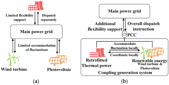 Before vs. after coupling integration of thermal power and renewable energy generation. (a) Operate independently; (b) Coupling integration.