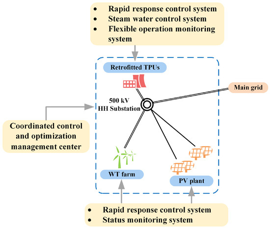 In this case study, the proposed approach is applied to evaluate the flexibility potential of retrofitted TPUs for accommodating RESs from a real-world project situated in the Liaoning Province, Northeast China. This project encompasses two 600 MW TPUs, a wind farm with an installed capacity of 300 MW, and two PV plants with a combined capacity of 400 MW. These power sources can achieve coupling integration through the 500 kV HH substation, as depicted in Figure 3.