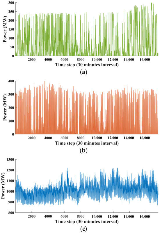 Historical data of WT, PV, and load demand. (a) Wind data; (b) Photovoltaic data; (c) Load demand data.