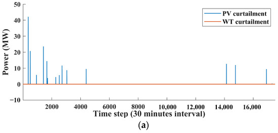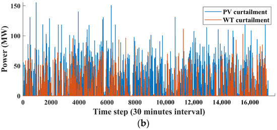 Comparison of renewable energy curtailment. (a) After coupling integration with retrofitted TPUs; (b) Before coupling integration and without retrofitted TPUs.