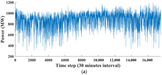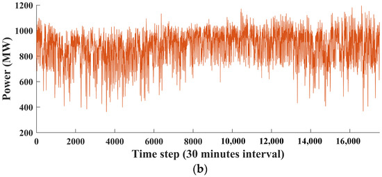 The data for WT, PV, and load demand data are collected on a 30 min interval scale, totaling 17,520 time-steps throughout the year from the study area, as illustrated in Figure 4. The PDFs of fluctuations are derived from Reference [32], and the parameters of the fluctuations are calculated from historical data. , , , , , , , , , . For the winter season (November to next April), . For the summer season (May to October), . Additional parameters about TPUs such as operation costs and pollution treatment functions, can be found in [35]. The MILP is solved by the Gurobi solver Version 10.0.1 [36] coded in the Matlab 2022a software. The case study is run on a PC with an Intel core i7-13700K (Intel, Santa Clara, CA, USA), 3.40 GHz, and 32 GB of RAM. The established optimization model has 192,720 continuous variables and 122,640 binary variables. The solution time is about 2 h for both before and after coupling integration.