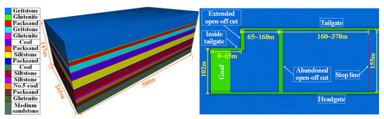 To study the evolution of abutment pressure, the stress and deformation of the mining roadway during the mining process of SHCSHRFB, FLAC3D 6.0 numerical software was used to simulate the advance of the 110501 working face; the constitutive model is the Mohr–Coulomb model. The mining simulation of the 110501 working face can be divided into the stage before the extended open-off cut, the stage between the extended open-off cut and the abandoned open-off cut, and the stage after the abandoned open-off cut. The above three stages correspond to the advance lengths of 0 to 65 m, 65 m to 160 m, and 160 to 370 m, respectively. The numerical model is shown in Figure 5; the strata parameters are shown in Table 1.