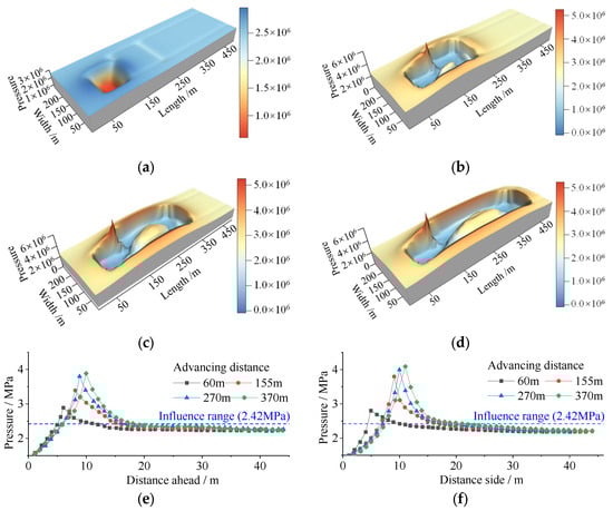 Abutment pressure variation as the working face advances. (a) Advance of 60 m. (b) Advance of 155 m. (c) Advance of 270 m. (d) Advance of 370 m. (e) Front abutment pressure. (f) Side abutment pressure.