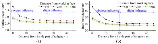 The initial length of the open-off cut in the 110501 working face is 102 m. After the 110501 working face advanced to the extended open-off cut, the length of the working face increased to 155 m. The roof subsidence and the vertical stress of surrounding rock at different positions of the extended open-off cut are shown in Figure 7: the closer to the inside tailgate, the larger the roof subsidence and the vertical stress of the extended open-off cut, and the range that was significantly affected by the mining of the working face was within 15 m of the extended open-off cut. When the working face was 25 m and 45 m from the extended open-off cut, the roof subsidence and the maximum vertical stress of the surrounding rock were not affected by mining at the face; when the working face was 5 m from the extended open-off cut, the roof subsidence of the extended open-off cut near the inside tailgate was increased rapidly to 66 mm, and the maximum vertical stress increased from 2.94 MPa to 3.77 MPa; therefore, when the working face is less than 25 m from the extended open-off cut, the support of the extended open-off cut within 15 m from the inside tailgate should be strengthened.