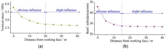 Vertical stress and roof subsidence of extended open-off cut. (a) Vertical stress. (b) Roof subsidence.