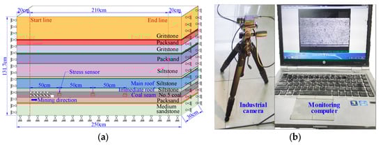 The model monitoring instrument and layout are shown in Figure 9. The BZ2205C stress sensors, which were placed in the coal seam 50 m, 100 m, and 150 m away from the open-off cut, were used to record the abutment pressure of the working face. The non-contact full-field strain measurement system (MatchID-2D v.2019) was used to monitor the displacement of the strata, which includes the analysis software, camera, lighting and notebook. The software uses the method of digital image capture and recognition to analyse the deformation of the physical model. Firstly, the model surface needs to be whitewashed and black spots are spotted. Then, the software performs binarisation and image analysis on the photos taken, and finally, the displacement cloud map in the process of model excavation is obtained.