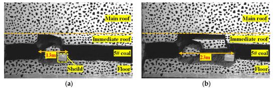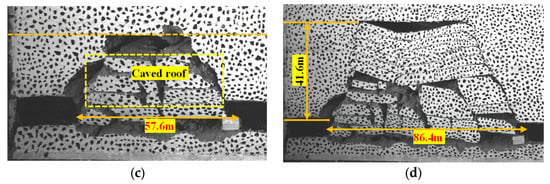 Main roof breaking characteristics of the 110501 working face. (a) Advance of 13 m. (b) Advance of 23 m. (c) Advance of 57.6 m. (d) Advance of 86.4 m.