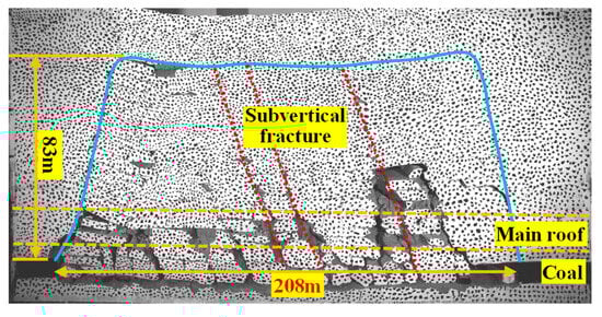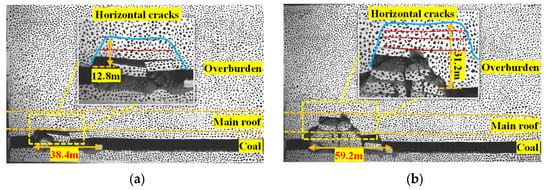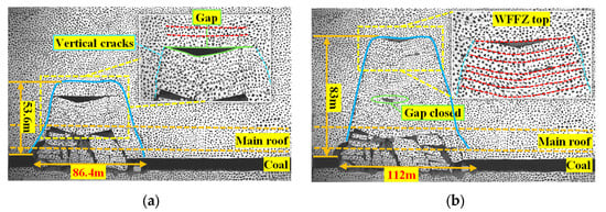 Figure 12 shows that when the working face advanced to 86.4 m, the WFFZ height rapidly rose to 53.6 m. Some cracks within the height range of 41.6 m to 53.6 m were only horizontal cracks with a small opening size, which were not connected to the lower cracks. At 41.6 m above the coal seam, a 3 m to 4 m gap was created between the siltstone and the upper 13.2 m thick, hard, fine sandstone. When the working face advanced to 112 m, the WFFZ developed rapidly to 83 m, and at this time, the gap at 41.6 m above the coal seam reclosed.