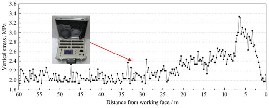 Figure 14 shows the vertical stress monitored by a stress sensor placed at 150 m from the open-off cut; when the stress sensor was 20 m from the working face, the monitored vertical stress was maintained at about 2.2 MPa. When the distance from the working surface reduced to 7 m, the vertical stress gradually increased to a peak value of 3.3 MPa; therefore, at the 110501 working face, the front abutment pressure raised some 7 m from the working face, and the range of influence of the front abutment pressure was about 20 m to 25 m, which is closer to that predicted by numerical simulation.