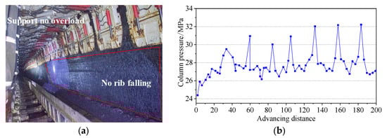 Column pressure and working face support result. (a) Working face support result. (b) hydraulic support column pressure.