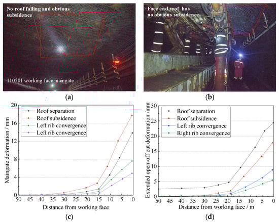 Support effect in maingate and extended open-off cut. (a) Maingate roof deformation photo. (b) Face end deformation photo. (c) Maingate deformation value. (d) Extended open-off cut deformation value.