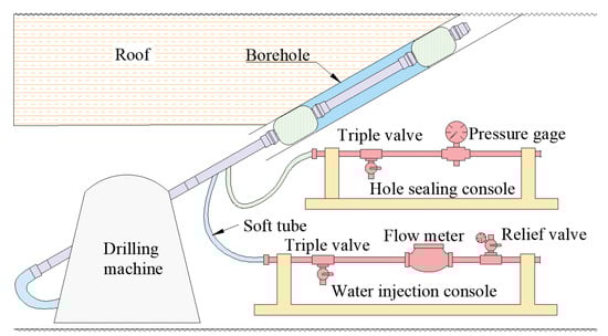 It can be seen from Figure 17 that, the height of the WFFZ was detected using a water-injection method. We drilled a hole diagonally above the working face, then used a double-capsule sealer to conduct section-by-section water injection and finally determined the fracture zone height from the changes in water injection flow rate. Initially, using the common empirical formula used in China to calculate the height of the hydraulic fracture zone, when the overlying rock is a medium-hard rock layer, the empirical formula for the WFFZ is as follows:
