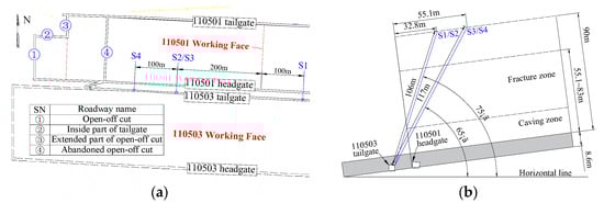 where HLi is the height of the WFFZ and ∑M is the cumulative mining thickness. The height of the WFFZ calculated using the two formulae represent 55.1 m and 68.7 m, respectively, and the WFFZ height obtained from physical similarity modelling is 83 m. To ensure clear observation, the end of the observation borehole was designed to be 90 m above the working surface. Figure 18 shows the layout of both control and observation boreholes: the boreholes were drilled from the roof of the 110503 tailgate to the overburden of the 110501 working face.